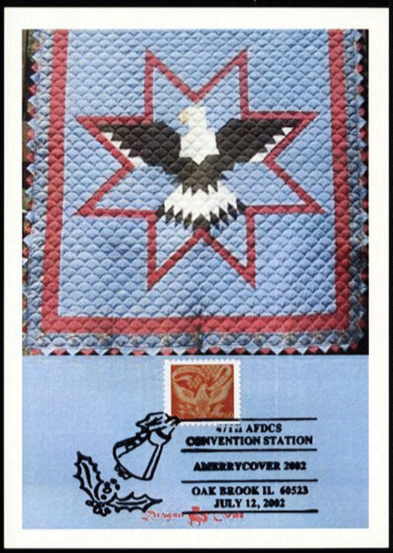 ![]() First Day Cover Coverlet Eagle Dgn 134b $3.00 Sc. 3646 Coverlet Eagle on a 5"x7" Dragon Card with color photo of patriotic eagle quilt, Americover 2002 show pictorial cancel (stamp was issued at the show). Great for a birds-, eagles-, crafts- or quilts--on-stamps collection! |