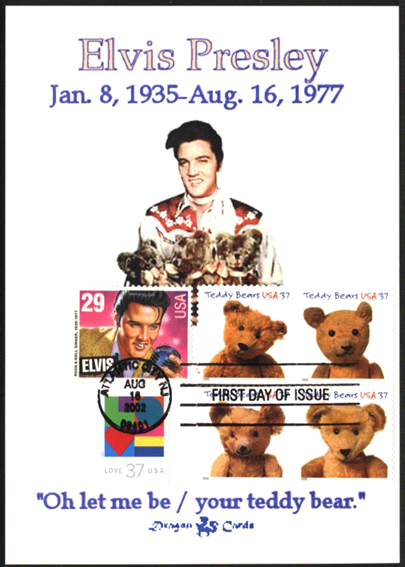 ![]() First Day Cover Love/Teddys/Elvis Dgn 137 $6.00 Sc. 3657 Love/Teddys/Elvis on a 5"x7" Dragon Card with color photo of Elvis Presley holding Teddy Bears. The Love stamp was issued on the 25th anniversary of his death, and the day after the Teddy Bears stamps were issued. Franked with the Love stamp, the block of 4 Teddys and an Elvis stamp, First Day of Issue hand cancel. Great for a teddy bears-, toys-, Elvis Presley-, love--on-stamps collection! |
