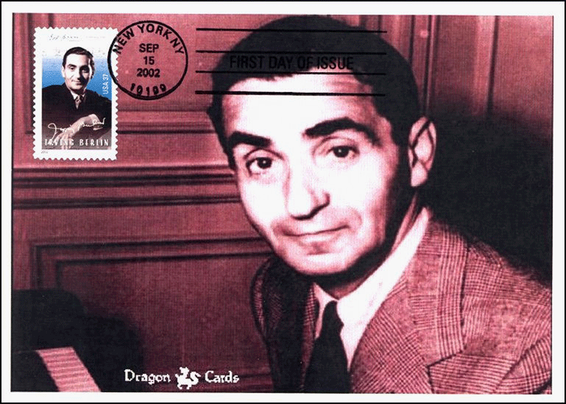 Sc. 3669 Irving Berlin on a 5"x7" Dragon Card with a photo of Berlin in a tweed jacket seated at a piano. First Day of Issue hand cancel. Great for an entertainment-, music-, theater-, Broadway-, -movies or Judiaca-on-stamps collection! Back To