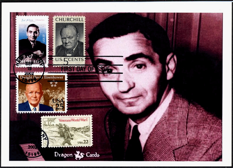 Sc. 3669 Irving Berlin on a 5"x7" Dragon Card "Super Patriot" Combo: Tweed jacket, with Eisenhower, Churchill, World War I stamps. Berlin wrote, produced and starred in shows during both World Wars to boost troops' morale. On one tour, meeting Churchill, the British leader mistook him for a political science scholar and their conversation was strange. Great for an entertainment-, music-, theater-, Broadway-, -movies or Judiaca-on-stamps collection!