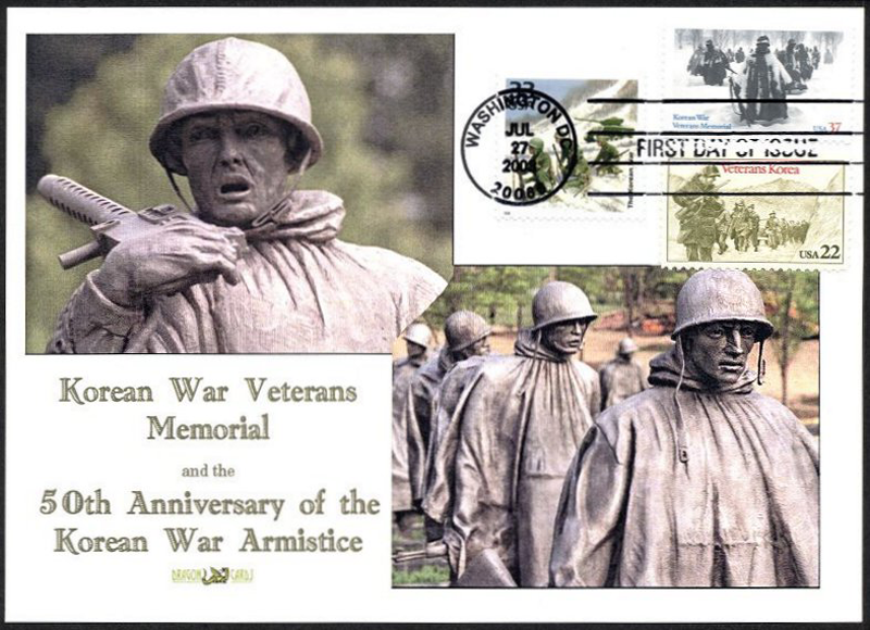 Sc. 3803 Korean War Vets Memorial on a 5"x7" Dragon Card showing color photographs (closeups) of the Memorial. First Day of Issue hand cancel ties the new stamp, Sc. 2152 (1985) and 3187e Celebrate the Century (1999) Korean War stamps. Great for a military- or veterans-on-stamps collection!