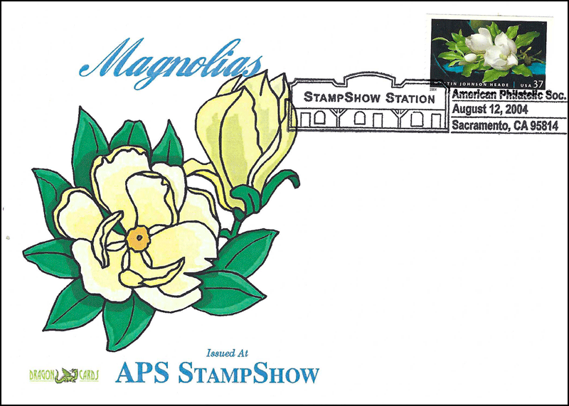 Sc. 3872 Magnolias on a 5"x7" Dragon Card with color art of magnolia blossoms. Stampshow 2004 hand cancel (first day). Great for a flowers-, stamp shows- or art-on-stamps collection! Back To