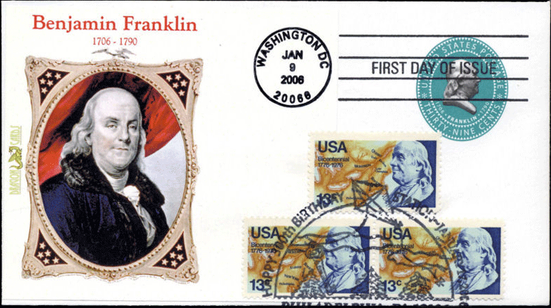Sc. U659 Benjamin Franklin No. 6¾ plain envelope with a Dragon Cards label cachet, tied by the First Day of Issue hand cancel plus 3 Sc. 1690 BF with the Philadelphia January 17th birthday postmark. Great for a Franklin- or Americana-on-stamps collection!