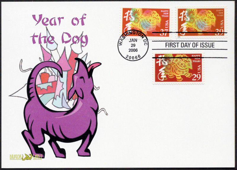 Sc. 3997k Year of the Dog on a Single from the 12-stamp sheet on a 5"x7" Dragon Card showing a dog and fireworks. First Day of Issue hand cancel With 2 previous Clarence Lee U.S. Year of the Dog stamps (29¢ and 37¢). Great for a holidays-, Lunar New Year- or dogs-on-stamps collection!