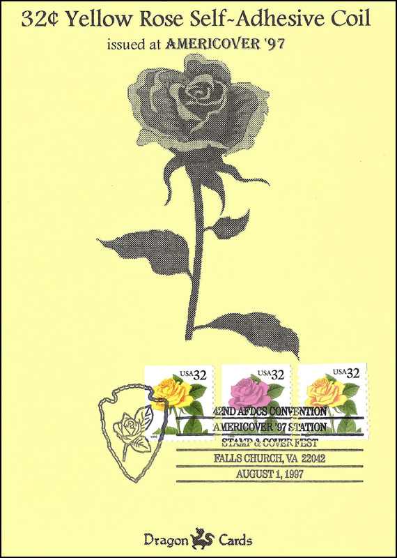 ![]() First Day Cover Yellow Rose coil Dgn 53b $3.50 Sc. 3054 Yellow Rose coil on a black-on-yellow 5"x7" card, with the 32¢ Yellow and Pink Rose booklet stamps, AMERICOVER '97 show cancel with a rose in it. (The stamp was issued at the show.) Great for a stamp shows- or flowers-on-stamps collection! |