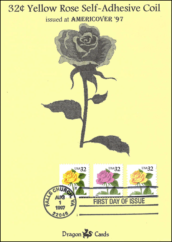 ![]() First Day Cover Yellow Rose coil Dgn 53c $3.50 Sc. 3054 Yellow Rose coil on a 5"x7" black-on-yellow Dragon Card with 32¢ Yellow and Pink Rose booklet stamps, and the First Day of Issue hand cancel. Great for a stamp shows- or flowers-on-stamps collection! |