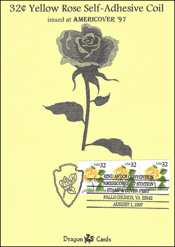 ![]() First Day Cover Yellow Rose coil Dgn 53p $3.50 Sc. 3054 Yellow Rose plate # strip of 3 on a black-on-yellow 5"x7" card, AMERICOVER '97 show cancel with rose in it. (The stamp was issued at the show.) Great for a stamp shows- or flowers-on-stamps collection! |