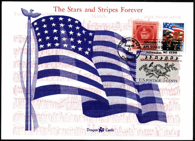 Sc. 3153 Stars & Stripes Forever on a Red, White and Blue 5"x7" Dragon Card. The background is the euphonium (baritone horn) part for the march in red; the foreground is the U.S. flag in blue. STAMPSHOW 97 first day hand cancel with Sc. 880 John Philip Sousa and Sc. 1252 American Music. Great for a music- or flags-on-stamps collection!