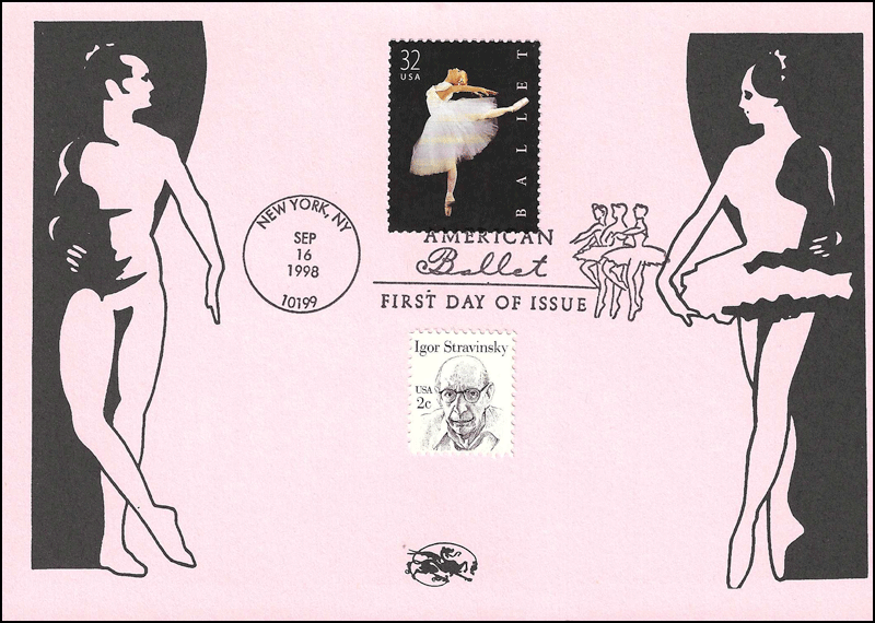 Sc. 3237 Ballet on a black-on-pink 5"x7" Dragon Card, showing male and female dancers flanking the center of the card, where the stamp, Sc. 1845 Stravinsky and the First Day of Issue postmark are. Unfortunately, the postmark doesn't touch ("tie") the Stravinsky stamp. Great for a music- or dance-on-stamps collection!