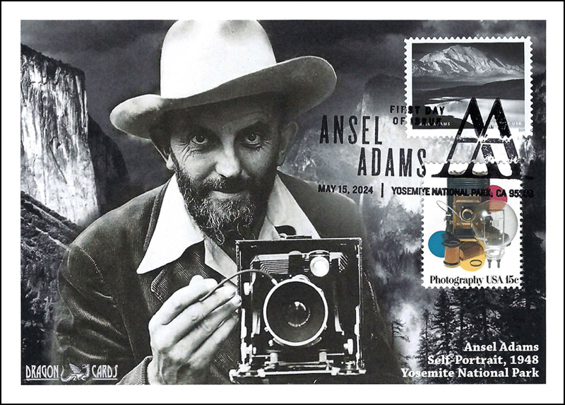Sc. 5854d Ansel Adams on a 5"x7" Dragon Card showing his 1948 self-portrait in Yosemite National Park. The Denali and Wonder Lake, Denali National Park, Alaska" single is tied with Sc. 1758 Photography (showing a camera similar to that in Adams' self-portrait) by the Pictorial Postmark. Great for a photography-, art- or parks-on-stamps collection!