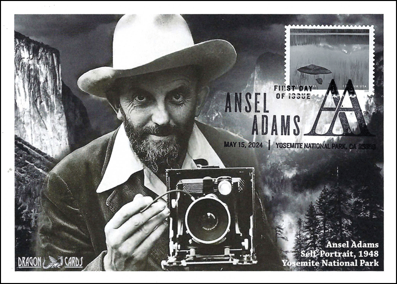 Sc. 5854g Ansel Adams on a 5"x7" Dragon Card showing his 1948 self-portrait in Yosemite National Park. A single "Rock and Grass, Moraine Lake, Sequoia National Park, California" stamp is tied with the Pictorial Postmark. Great for a photography-, art- or parks-on-stamps collection!