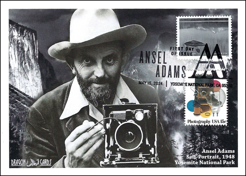 Sc. 5854g Ansel Adams on a 5"x7" Dragon Card showing his 1948 self-portrait in Yosemite National Park. The "Rock and Grass, Moraine Lake, Sequoia National Park, California" single is tied with Sc. 1758 Photography (showing a camera similar to that in Adams' self-portrait) by the Pictorial Postmark. Great for a photography-, art- or parks-on-stamps collection!
