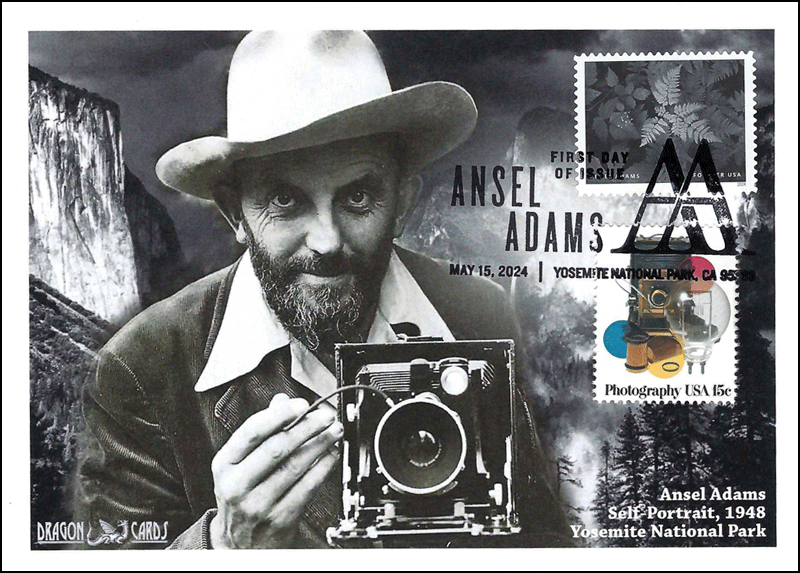 Sc. 5854h Ansel Adams on a 5"x7" Dragon Card showing his 1948 self-portrait in Yosemite National Park. The "Leaves, Mount Rainier National Park, Washington" single is tied with Sc. 1758 Photography (showing a camera similar to that in Adams' self-portrait) by the Pictorial Postmark. Great for a photography-, art- or parks-on-stamps collection!