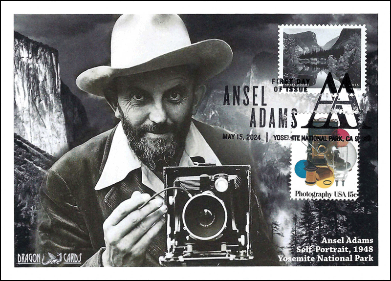 Sc. 5854l Ansel Adams on a 5"x7" Dragon Card showing his 1948 self-portrait in Yosemite National Park. The "Mirror Lake, Mount Watkins, Spring, Yosemite National Park, California" single is tied with Sc. 1758 Photography (showing a camera similar to that in Adams' self-portrait) by the Pictorial Postmark. Great for a photography-, art- or parks-on-stamps collection!