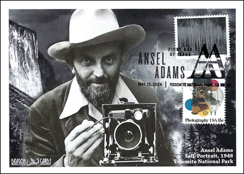 Sc. 5854n Ansel Adams on a 5"x7" Dragon Card showing his 1948 self-portrait in Yosemite National Park. The "Aspens, Dawn, Autumn, Dolores River Canyon, Colorado" single is tied with Sc. 1758 Photography (showing a camera similar to that in Adams' self-portrait) by the Pictorial Postmark. Great for a photography-, art- or parks-on-stamps collection!