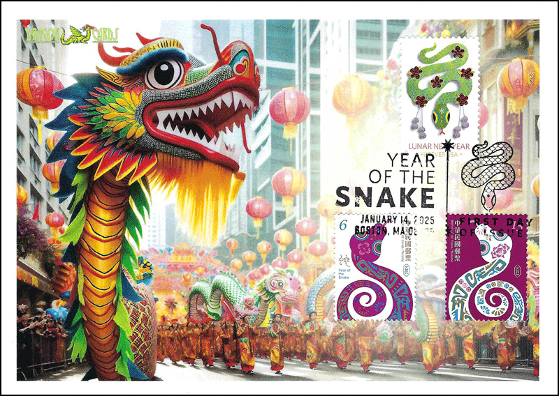Sc. 5952 Year of the Snake on a 5"x7" Dragon Card with colorful original art of a lunar new year parade, featuring giant snake puppets. The Pictorial Postmark ties the U.S. stamp and the Taiwan stamps. Great for a snakes-, reptiles- or Lunar Holidays-on-stamps collection!