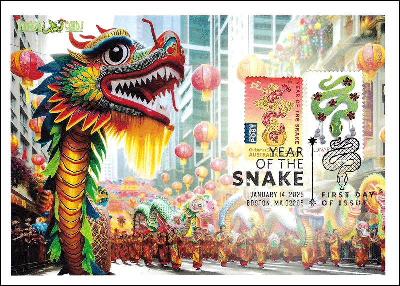 Sc. 5952 Year of the Snake on a 5"x7" Dragon Card with colorful original art of a lunar new year parade, featuring giant snake puppets. The Pictorial Postmark ties the U.S. stamp and the Christmas Island self-adhesive single. Great for a snakes-, reptiles- or Lunar Holidays-on-stamps collection!