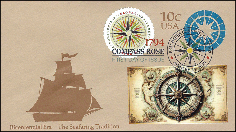 Sc. TBA 1794 Compass Rose on a A label featuring AI-created artwork (by Dragon Cards) of a late-18th century compass rose is affixed to a No. 6¾ Sc. U571 Seafaring envelope whose indicia shows a compass rose.In the "sea" areas of the label is legend "here be Dragon Cards," similar to early maps that warned travelers of unknown dangers at the edges of the earth. The Digital Color Postmark ties the new stamp, the indicia and the label.. Great for a Navigation-, travel- or maps-on-stamps collection!