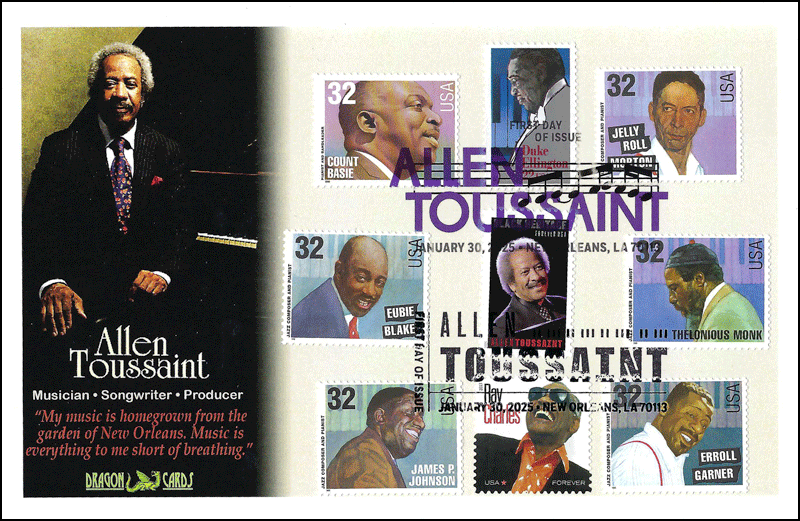 Sc. 5957 Allen Toussaint on a 5½"x8½" Dragon Card showing him in front of an open grand piano. Eight additional stamps show other jazz pianists. The Digital Color Postmark and Pictorial Postmark tie all 9 stamps. Great for a music-, black history- or jazz-on-stamps collection!