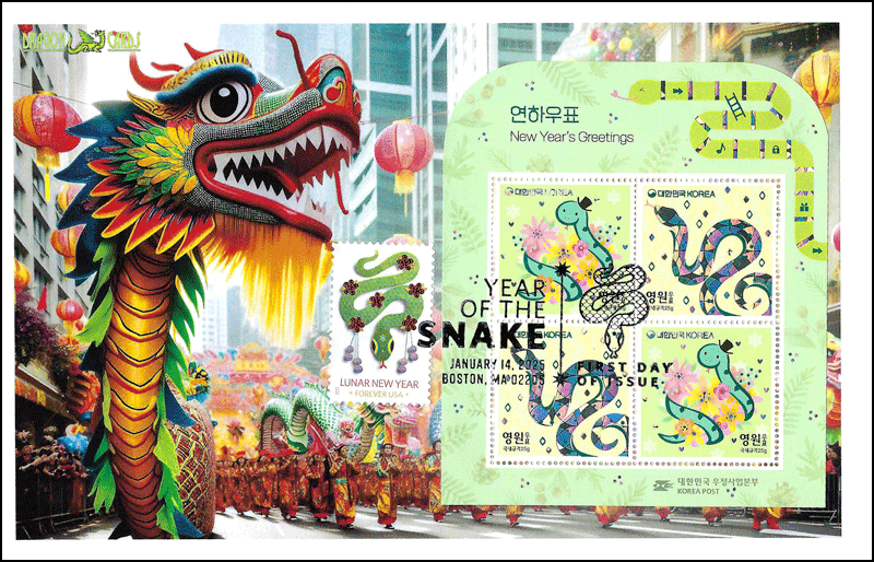 Sc. 5952 Year of the Snake on a 5½"x8½" Dragon Card with colorful original art of a lunar new year parade, featuring giant snake puppets. The Pictorial Postmark ties the U.S. stamp and the Korea souvenir sheet. Great for a snakes-, reptiles- or Lunar Holidays-on-stamps collection!