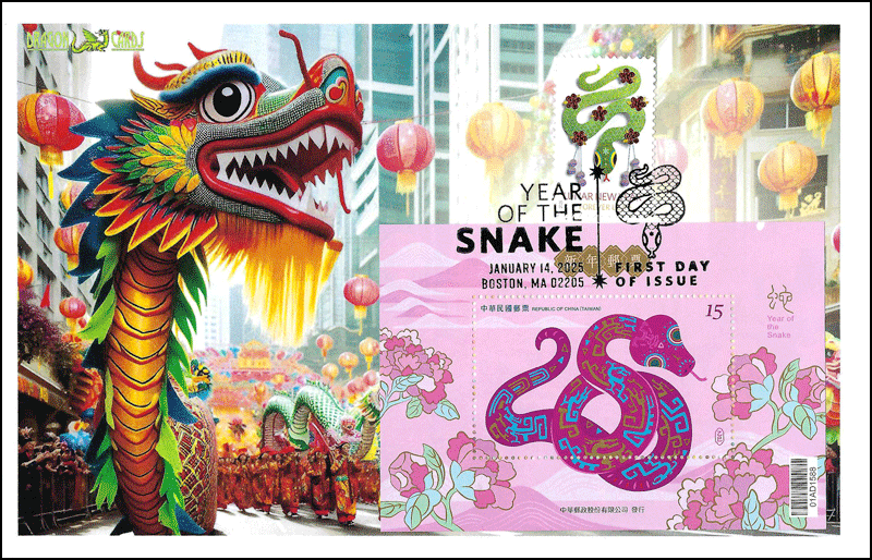 Sc. 5952 Year of the Snake on a 5½"x8½" Dragon Card with colorful original art of a lunar new year parade, featuring giant snake puppets. The Pictorial Postmark ties the U.S. stamp and the Taiwan souvenir sheet. Great for a snakes-, reptiles- or Lunar Holidays-on-stamps collection!