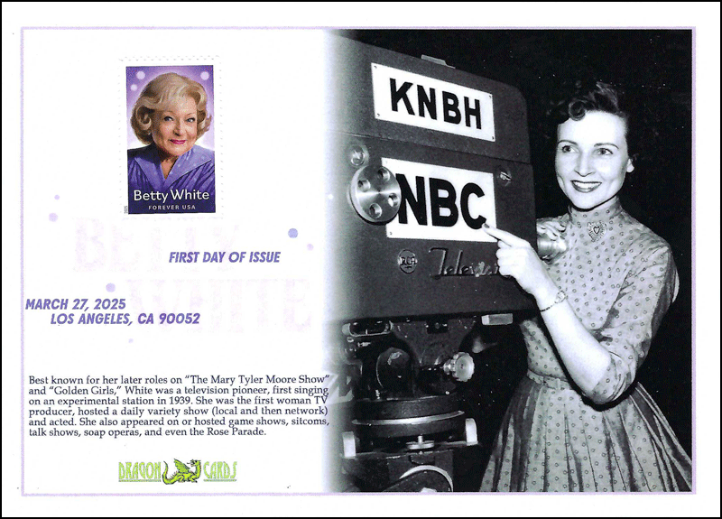 Sc. Betty White on a 5"x7" Dragon Card with a picture of White in 1954 with a television camera on the set of "The Betty White Show." She was not only the host but also a producer — the first female producer in network television. Digital Color Postmark (which is so light-colored that it is hard to see in the picture here). Great for a television- or entertainment-on-stamps collection!