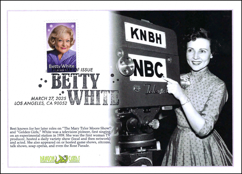 Sc. Betty White on a 5"x7" Dragon Card with a picture of White in 1954 with a television camera on the set of "The Betty White Show." She was not only the host but also a producer — the first female producer in network television. Pictorial Postmark. Great for a television- or entertainment-on-stamps collection!