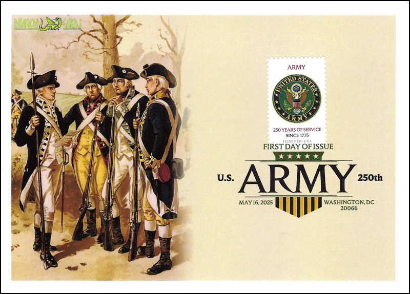 Sc. 6003 U.S. Army on a 5"x7" Dragon Card showing a print from about 1897 of four soldiers standing in an informal group. Their uniforms and weapons are from 1779 to 1783. Digital Color Postmark. Great for an Americana- or military-on-stamps collection!