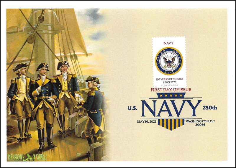 Sc. 6004 U.S. Navy on a 5"x7" Dragon Card featuring an 1899 print of the "Commander in Chief of [the] Navy on deck of ship with three other naval personnel" in 1776. Digital Color Postmark. Great for an Americana- or military-on-stamps collection!