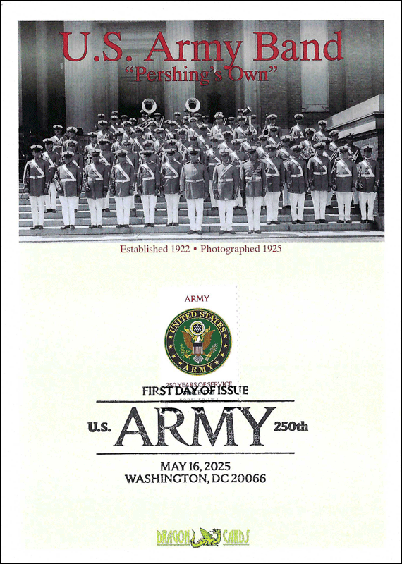 Sc. 6003 U.S. Army on a 5"x7" Dragon Card showing a photo of the band in 1925. "Pershing's Own" was established in 1925. Pictorial Postmark. Great for a music- or military-on-stamps collection!