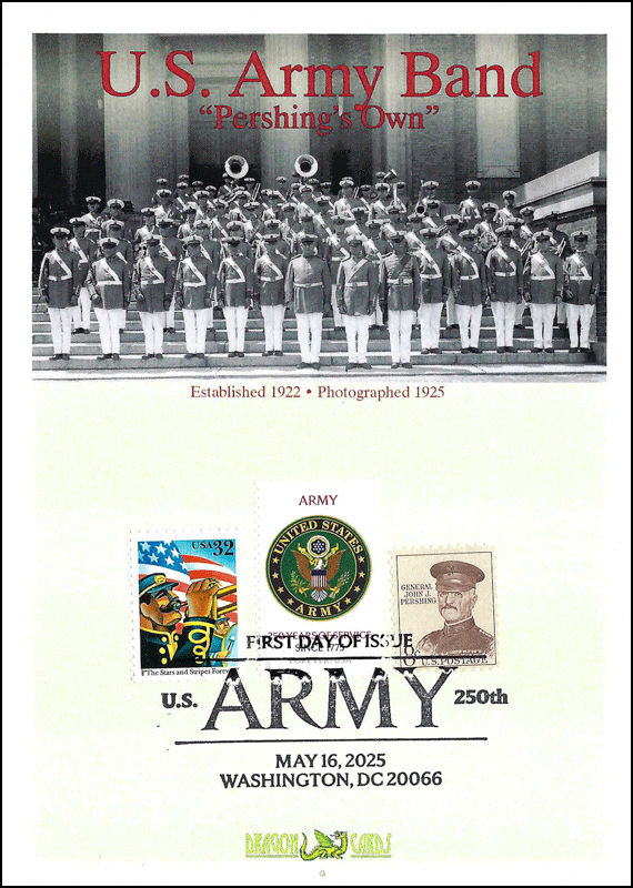 ![]() First Day Cover U.S. Army Band Dgn 858b $4.00 Sc. 6003 U.S. Army Band on a 5"x7" Dragon Card showing a photo of the band in 1925. "Pershing's Own" was established in 1925. The pictorial postmark ties Sc. 1214 Gen. John J. Pershing and Sc. 3153 "Stars & Stripes Forever." Pershing ordered the establishment of the U.S. Army Band in 1922. It is known as "Pershing's Own." Great for a music- or military-on-stamps collection! |