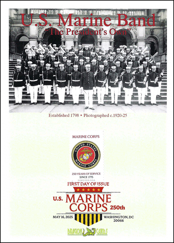 ![]() First Day Cover U.S. Marines Band Dgn 860 $4.00 Sc. 6005 U.S. Marines on a 5"x7" Dragon Card showing a photo of the band from around 1920 to 1925. It is standing in front of the Library of Congress. The band was established in 1798. Digital Color Postmark. Great for a music- or military-on-stamps collection! |