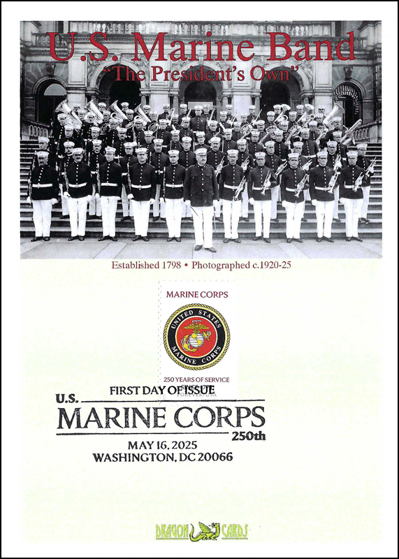 ![]() First Day Cover U.S. Marines Band Dgn 860a $3.00 Sc. 6005 U.S. Marines on a 5"x7" Dragon Card showing a photo of the band from around 1920 to 1925. It is standing in front of the Library of Congress. The band was established in 1798. Pictorial Postmark. Great for a music- or military-on-stamps collection! |