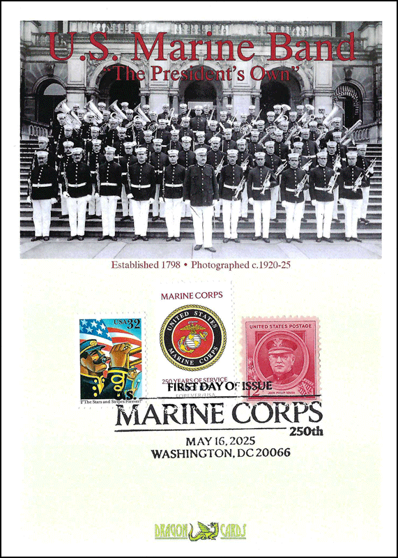 ![]() First Day Cover U.S. Marine Band Dgn 860b $4.00 Sc. 6005 U.S. Marines on a 5"x7" Dragon Card showing a photo of the band from around 1920 to 1925. It is standing in front of the Library of Congress. The band was established in 1798. The pictorial postmark ties Sc. 880 Famous Americans/John Philip Sousa and Sc. 3153 "Stars & Stripes Forever." Sousa conducted the Marine Band from 1880 to 1892. He enlisted in the Marine Corps at the age of 13 as an apprentice musician and left 7 years later. Great for a music- or military-on-stamps collection! |