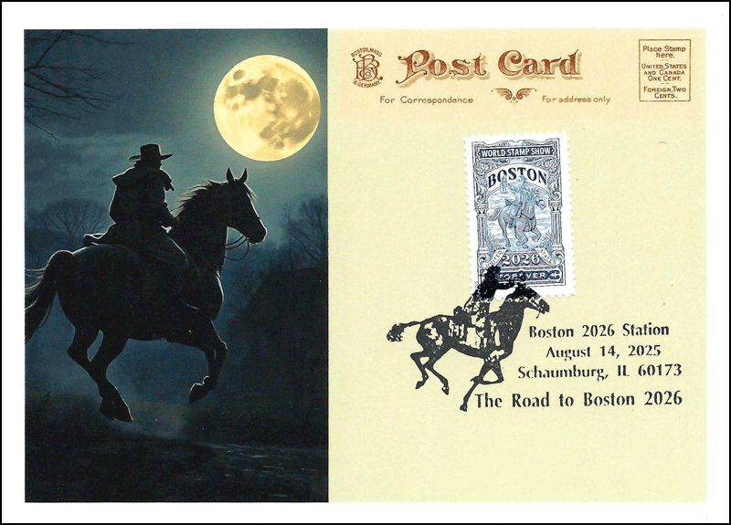 Sc. 6030 Boston 2026 on a 5"x7" Dragon Card reproducing art of a man riding a horse at night. Boston 2026 pictorial postmark for the first-day. Great for a stamp shows-, Americana- and military-on-stamps collection! Back To