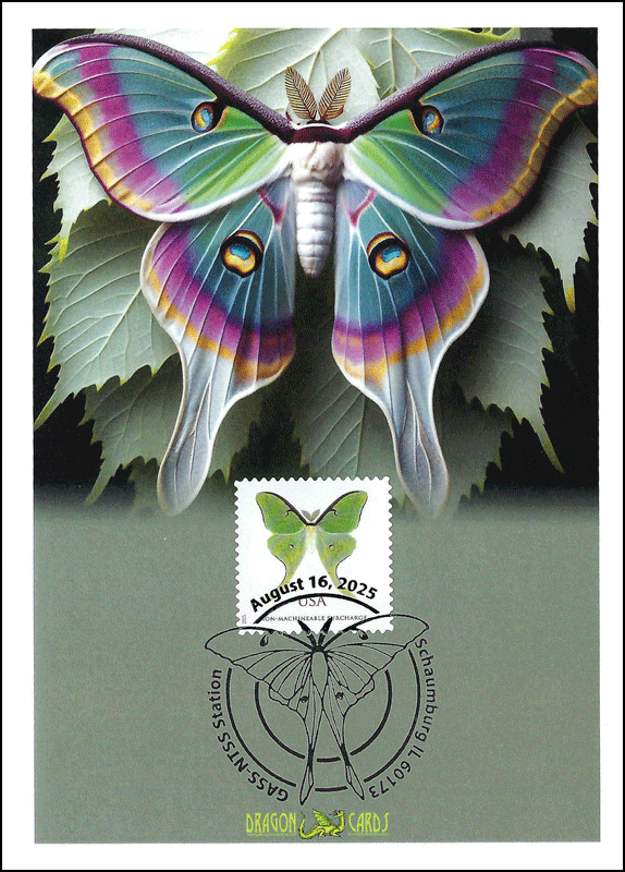 ![]() First Day Cover Luna Moth Dgn 866 $4.00 Sc. 6031 Luna Moth on a 5"x7" Dragon Card featuring Artificial intelligence artwork by Dragon Cards of a luna moth. National Topical Stamp Show pictorial. Great for a butterflies-, moths- or insects-on-stamps collection! |