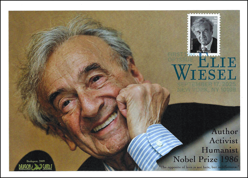 Sc. 6037 Elie Wiesel on a 5"x7" Dragon Card reproducing a photo of him in Budapest in 2009, his first trip back to Hungary since the Holocaust. Digital Color Postmark. Great for a Judaica- or authors-on-stamps collection! Back To