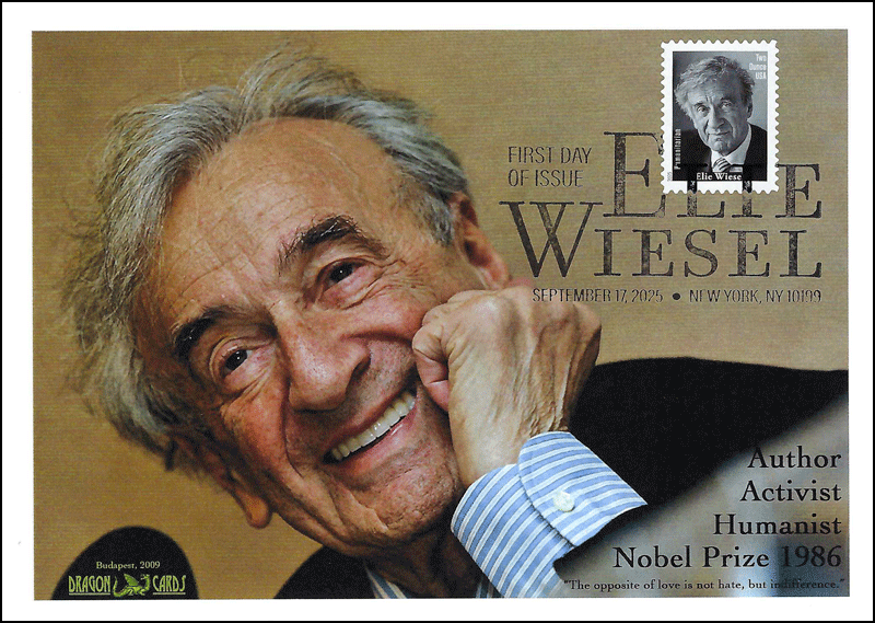 Sc. 6037 Elie Wiesel on a 5"x7" Dragon Card reproducing a photo of him in Budapest in 2009, his first trip back to Hungary since the Holocaust. Pictorial Postmark. Great for a Judaica- or authors-on-stamps collection! Back To