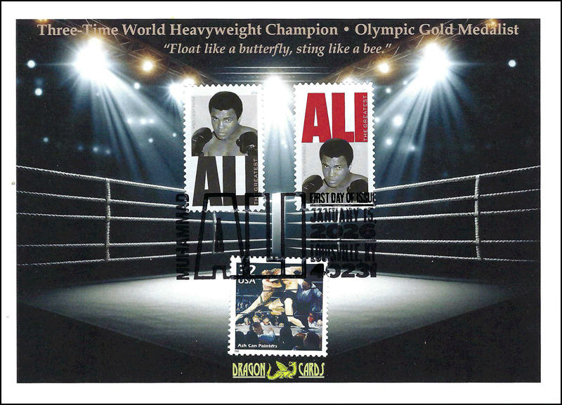 Sc. TBA Muhammad Ali on a 5"x7" Dragon Card showing a boxing ring lit by spotlights. Above it is text "Three-Time World Heavyweight Champion • Olympic Gold Medalist" and the quotation "Float like a butterfly, sting like a bee." The pictorial postmark ties the two new stamps plus Sc. 3182h Ash Can Painters (CTC), which shows boxing. Great for a sports-, boxing- or black history-on-stamps collection!