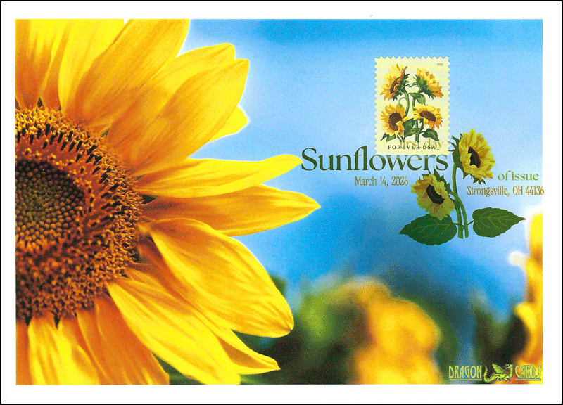 Sc. TBA Sunflowers on a 5"x7" Dragon Card showing a closeup photo of a sunflower, taken in Ukraine, where the sunflower is a national symbol. Digital Color Postmark. Great for a flowers-on-stamps collection! Back To