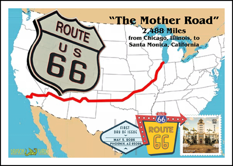 Sc. TBA Route 66 set of 8 singles on eight 5"x7" Dragon Cards (all same design) showing a map with the highway's route and the US 66 shield symbol. Digital Color Postmark. Great for a transportation- or Americana-on-stamps collection! Back To