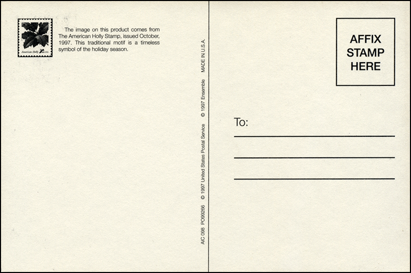 Sc. 3177 1997 Christmas Holly on a USPS picture postcard featuring the stamp design, with the stamp affixed to the face and tied by the First Day Of Issue hand cancel. This is a true maximum card because it was not produced for use as a philatelic collectible. Great for a Christmas-, holidays- or winter-on-stamps collection!