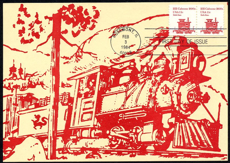 Sc. 1905 11¢ Caboose coil on a pair; 5"x7" red-on-buff Dragon Card; logging locomotive racing through woods; First Day of Issue hand cancel. Great for a Transportation Coil, trains, railroads-on-stamps collection!