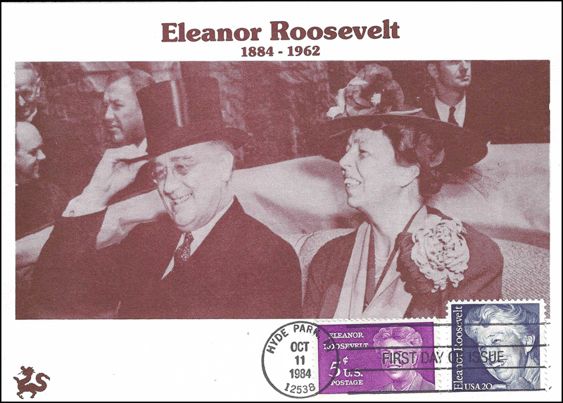Sc. 2105 Eleanor Roosevelt on a 5"x7" maroon-on-white Dragon Card, reproducing photo of ER & FDR in an inaugural parade. The First Day of Issue hand cancel ties the new stamp and Sc. 1236, the 1962 Eleanor Roosevelt stamp. Great for a Roosevelts-, women- or First Ladies-on-stamps collection!