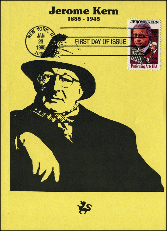 Sc. 2110 Jerome Kern on a 5"x7" black-on-yellow Dragon Card, portrait of the composer, First Day of Issue hand cancel. Great for a music- or Judaica-on-stamps collection!