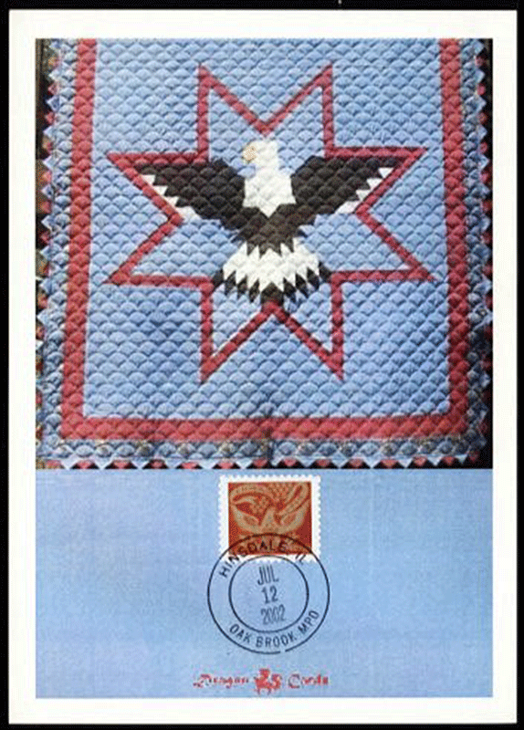 ![]() First Day Cover Coverlet Eagle Dgn 134a $3.00 Sc. 3646 Coverlet Eagle on a 5"x7" Dragon Card with color photo of patriotic eagle quilt, black double-ring Hinsdale IL Oak Brook station) hand cancel. Great for a birds-, eagles-, crafts- or quilts--on-stamps collection! |