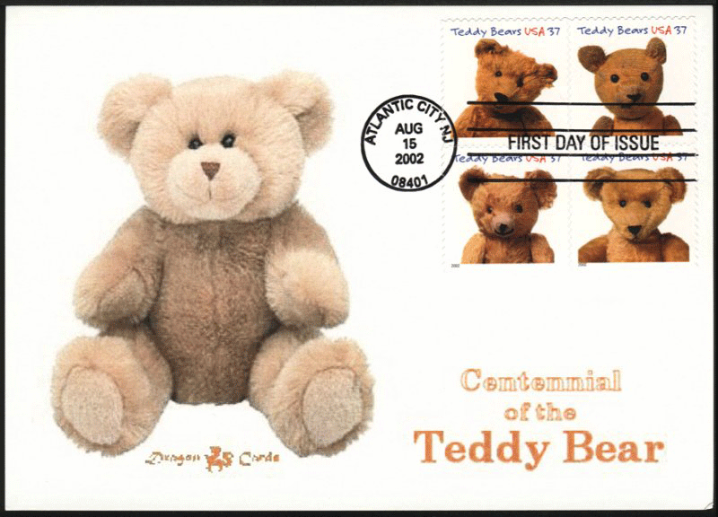 Sc. 3653-6 Teddy Bears - Cmcl on a block of 4 on a 5"x7" Dragon Card with commercial color photo of a teddy bear, First Day of Issue hand cancel. Great for a teddy bears- or toys-on-stamps collection! Back To