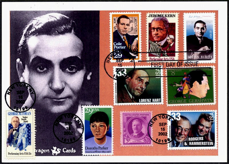 Sc. 3669 Irving Berlin on a 5"x7" Dragon Card "Friends and Colleagues:" Older photo of Berlin, and stamps representing some of his many friends and colleagues: Cole Porter, Jerome Kern, Lorenz Hart, George and Gershwin, George Gershwin (who was turned down for a job by Berlin as too talented), Victor Herbert, Dorothy Parker, George M. Cohan. Tied by a First Day of Issue and. Great for an entertainment-, music-, theater-, Broadway-, -movies or Judiaca-on-stamps collection!