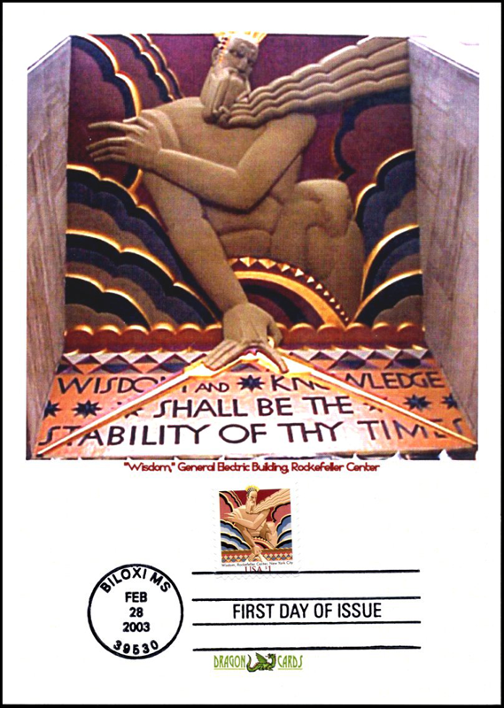 Sc. 3766 $1 Wisdom on a 5"x7" Dragon Card showing an original color photo of the mural at Rockefeller Center, First Day of Issue hand cancel. Great for a NYC- or art-on-stamps collection!