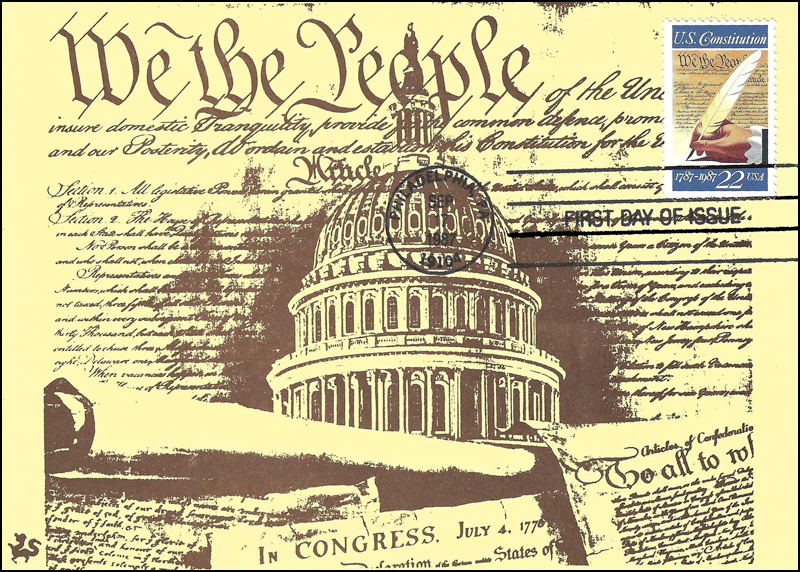 Sc. 2360 Signing Constitution on a 5- by 7-inch brown on buff card showing the Preamble of the Constitution and the Capitol Dome. First Day of Issue hand cancel. Great for a Bicentennial, government- or law-on-stamps collection! Back To